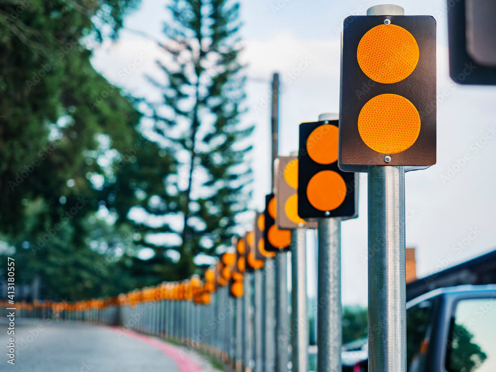 Road curve Barrier with yellow Reflection Sign Caution on a highway Safety system