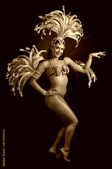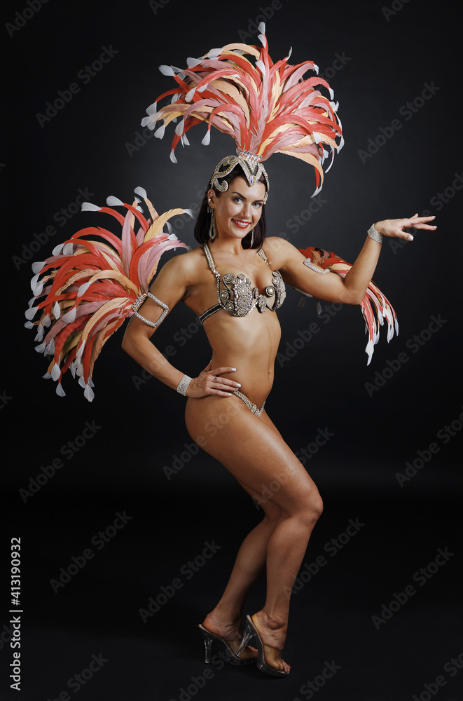 Attractive female cabaret dancer in carnival costume with red and pink feathers.