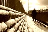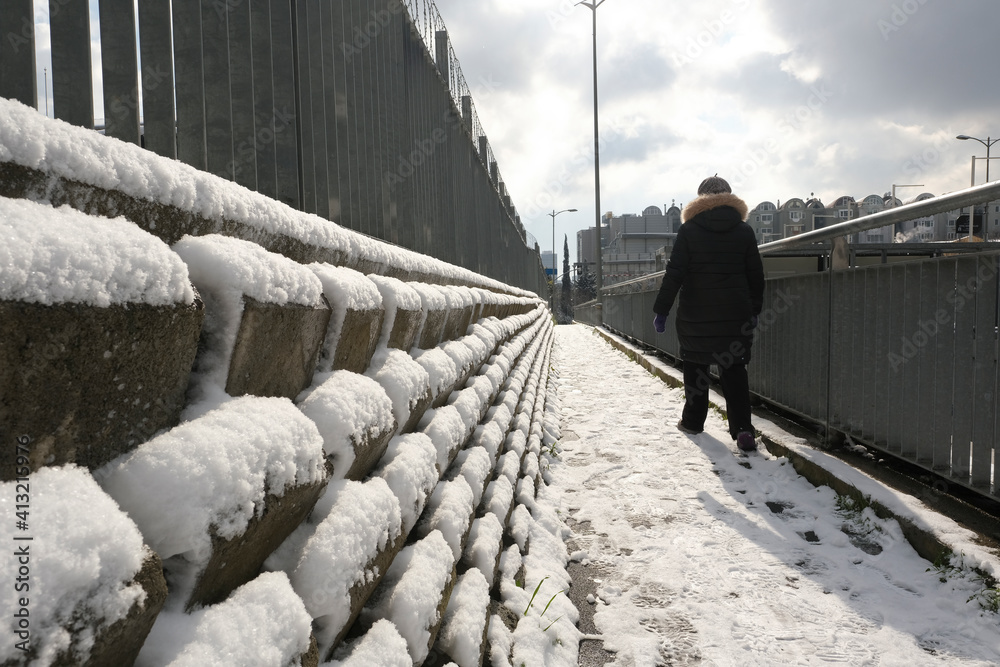A woman is walking on a snowy sidewalk. Stones are looking so beautiful.