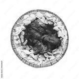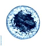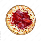 Strawberry tart with almond petals, isolated on white background, square frame. View from above, flat lay
