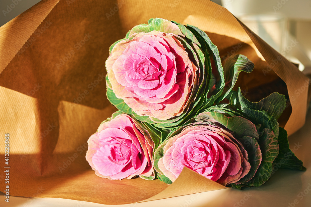 Close up image of lilac, purple cabbage bouquet packed in organic brown paper
