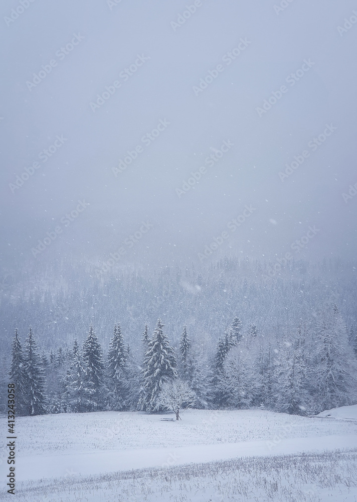 Winter snowfall landscape in Carpathian mountains, vertical shot. Wonderful idyllic snowing scene with a bench under a lone tree in front of a coniferous forest under snow. Foggy white woodland view