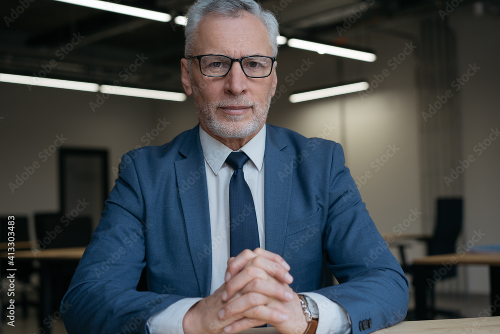 Portrait of pensive senior businessman wearing suit and glasses looking at camera sitting in office