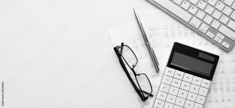 Calculator on financial statement and balance sheeet on desk of auditor. Concept of accounting and audit business.