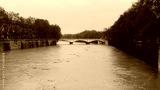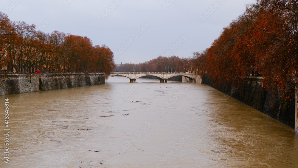 Rome, Italy Tiber river high tide water rise. Day view of high water level flooding the banks of the river crossing the Italian capital, after heavy rain.