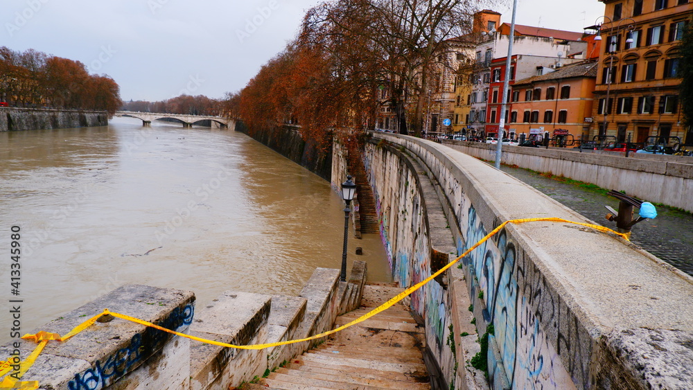 Rome, Italy: Tiber river high tide water rise with no cross yellow tape line. High water level flooding the banks of the river crossing the Italian capital, after heavy rain.
