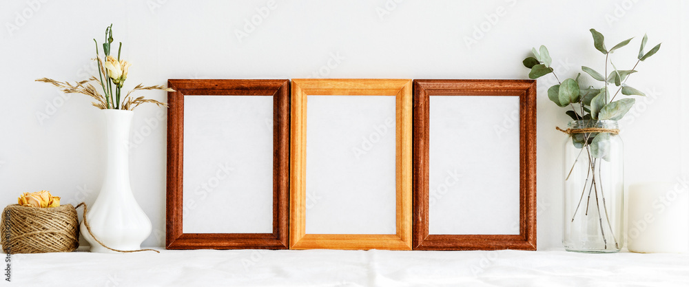 Wooden photo frame and dry white roses in a vase on a white background. Minimalistic, gentle summer layout. Blank for a postcard. Interior for design. Panorama.