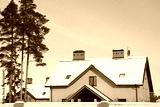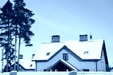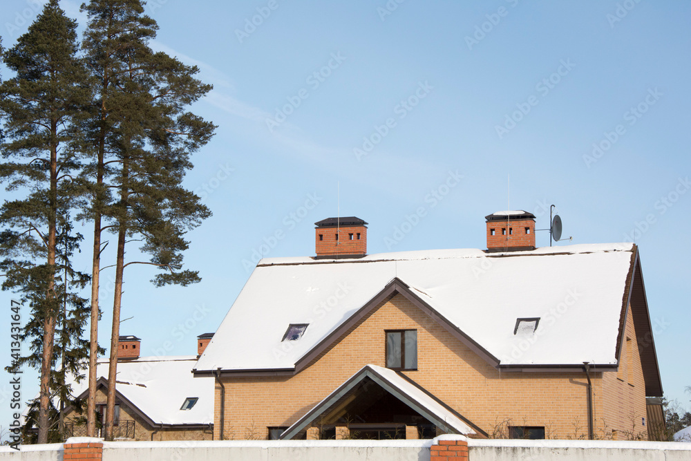 brick chimneys heated the cottage against a blue sky, the snow-covered roof of the cottage