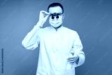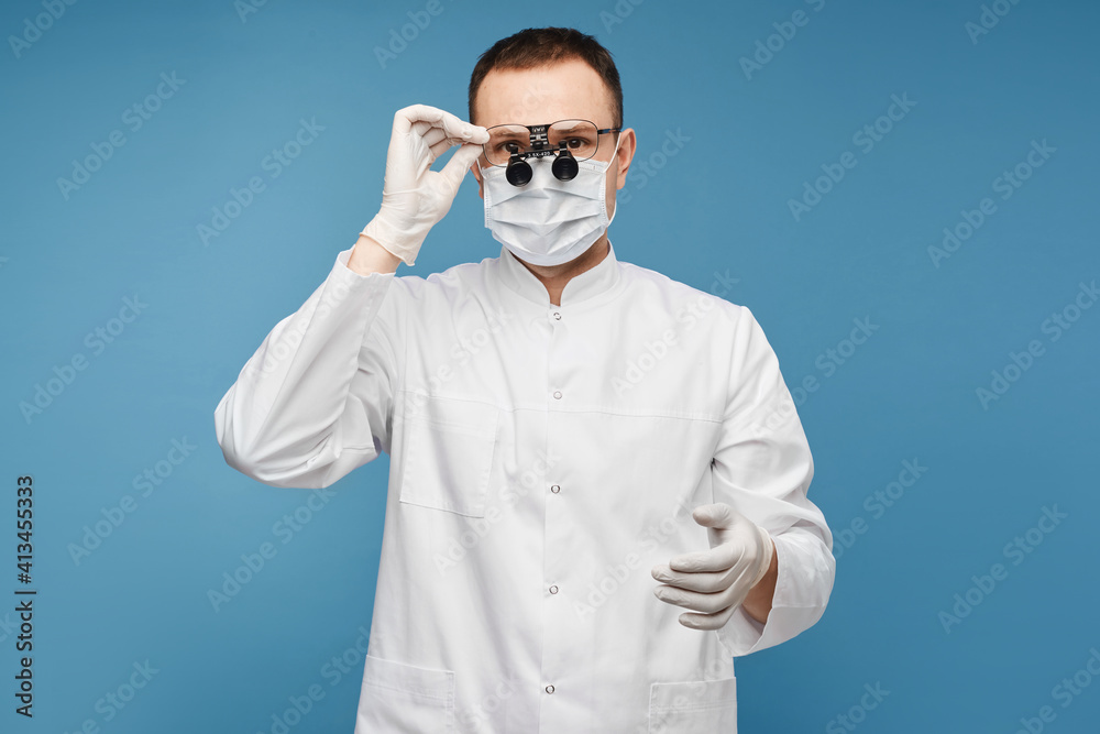 Caucasian male doctor in a surgical mask, protective gloves and binocular loupes at the blue background, isolated with copy space for text or product placement
