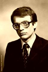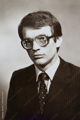 Portrait of young Soviet guy with glasses, in jacket and tie. Vintage black and white paper photo, 1970s. Transferred property, family archive. Outdated quality