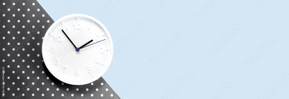 Plain wall clock on polka dot brown gray and blue background banner. Two o'clock. Close up copy space, time management or female owned business. lunch time. Opening or closing hours. Schedule