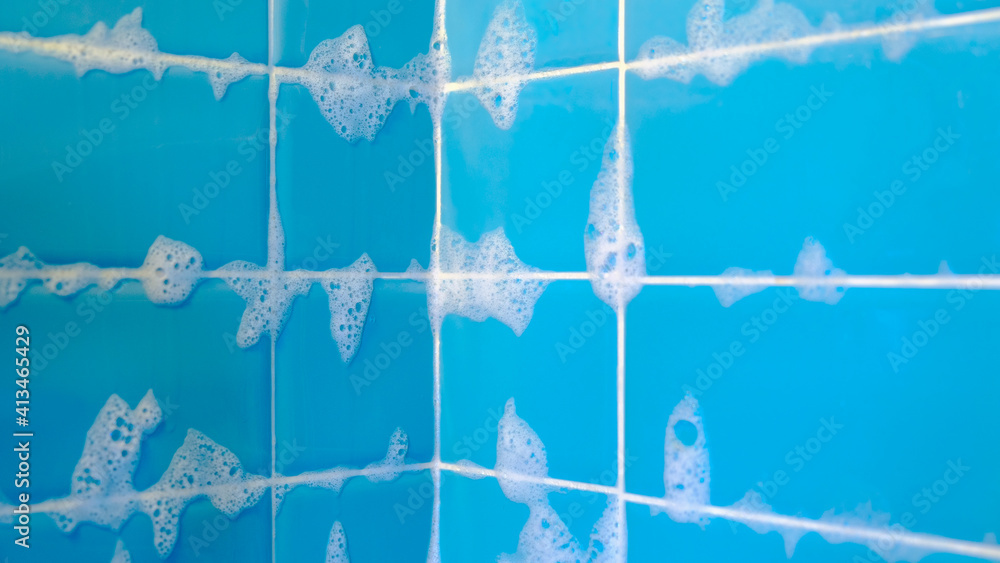 Bathroom shower blue tiles with lather suds soap foam after shower closeup selective focus background