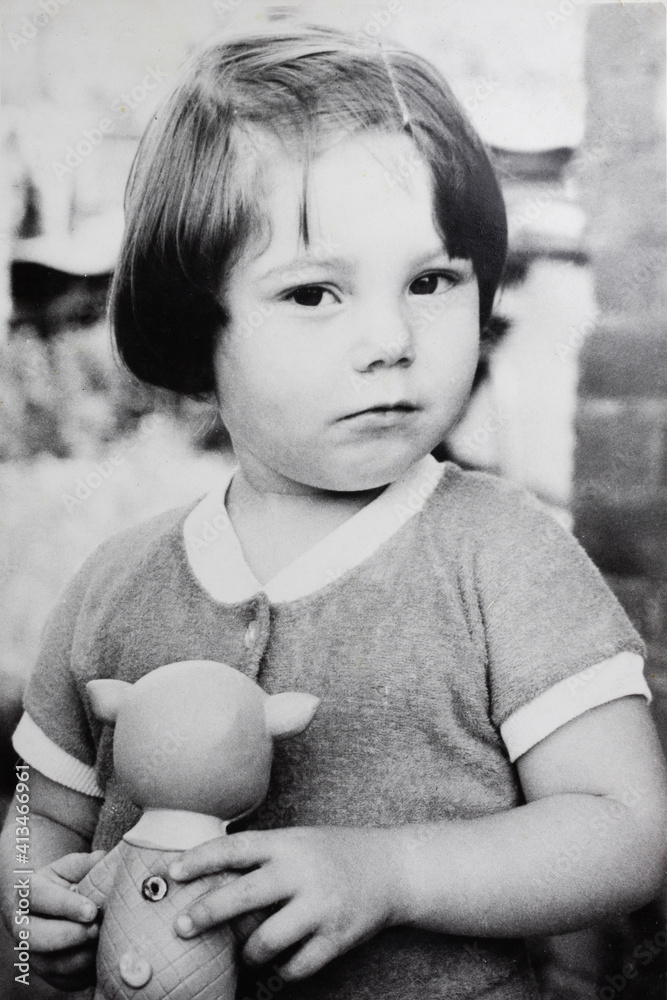 Portrait of little soviet girl with toy pig, black and white. Early 1980s. Old surface, soft focus. Transferred property, family archive.
