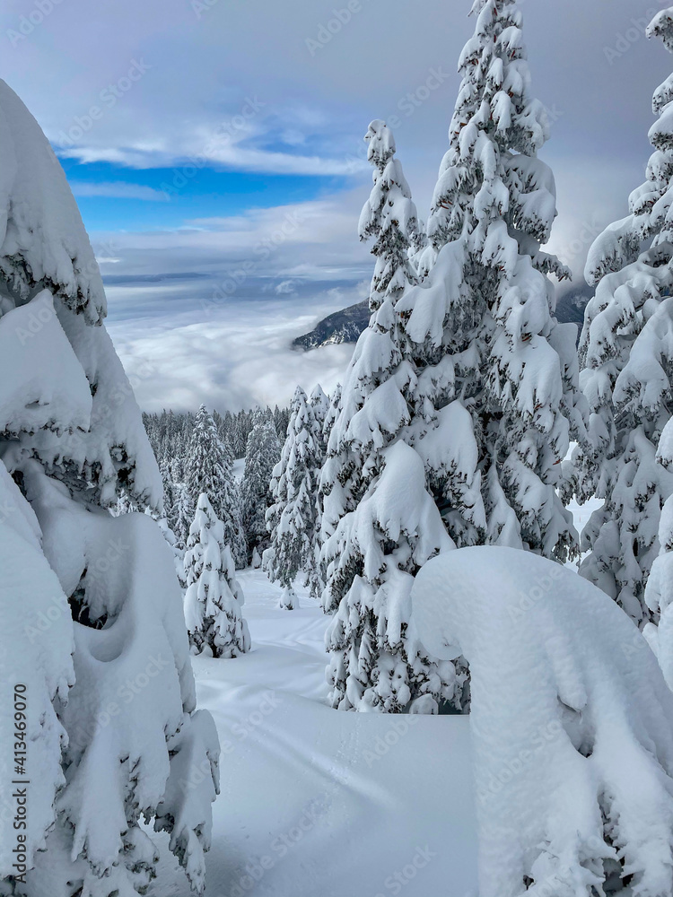 VERTICAL: Spectacular shot of spruce trees scattered around the snowy mountain.