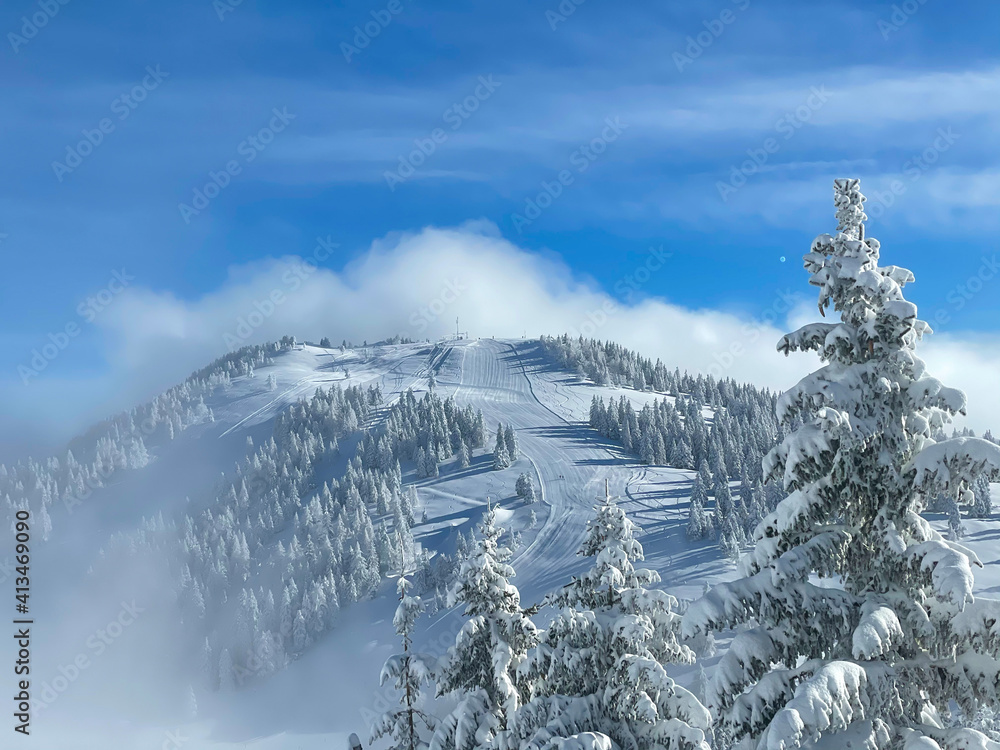 DRONE: Scenic view of the groomed slopes of a ski resort soaring into sunny sky.