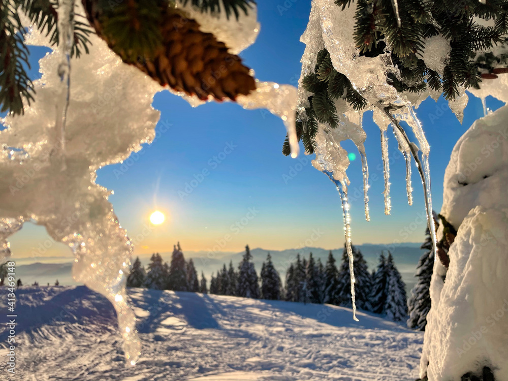 CLOSE UP: Golden evening sunbeams shine on the landscape and icy spruce twigs.