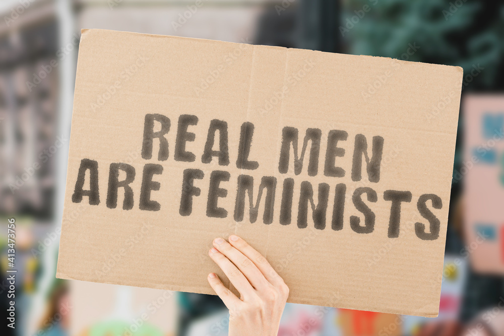 The phrase " Real men are feminists " on a banner in hand with blurred background. Protest. Movement. Strike. Feminism. Equality. Different. Human rights. Violation. Legislation