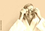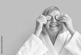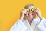 Cheerful senior woman with cucumber slices covering her eyes in front of her eyes on a yellow background. Spa beauty treatments at home, body care concept, organic cosmetics. Natural spa treatment.