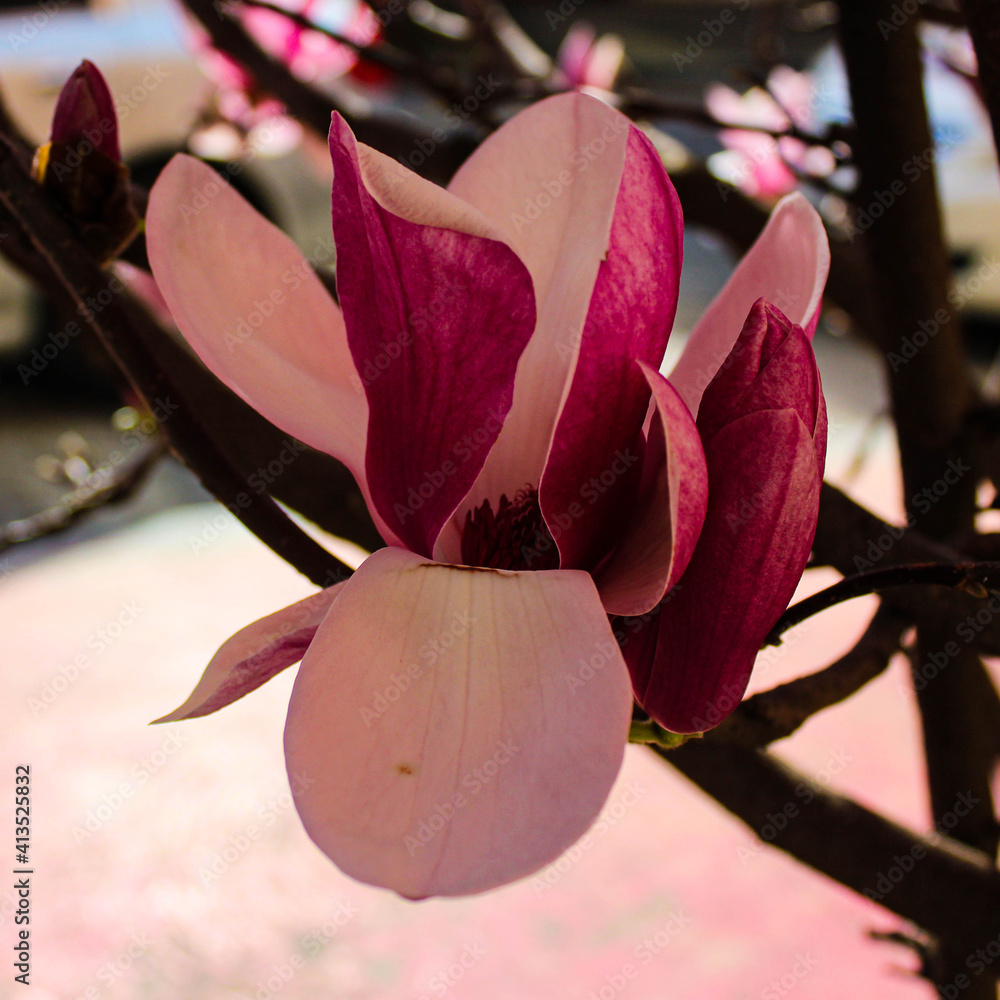 Beautiful Magnolia in Bloom, Pink Flowers in Sunny day. High quality photo