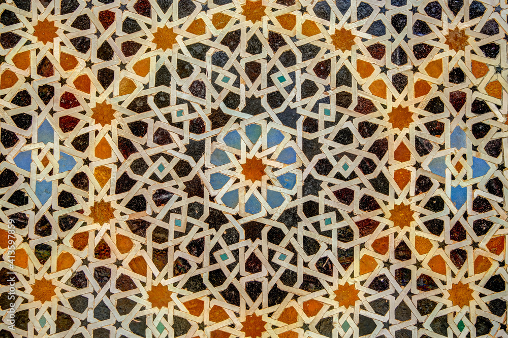 Intricate tile patterns, metal work and plaster carvings adorning building exteriors in Fez Morocco