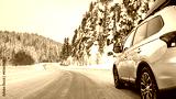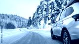 Suv car with rooftop cargo carrier trunk stay on roadside of winter road. Family trip to ski resort. Winter holidays adventure. car on winter road