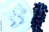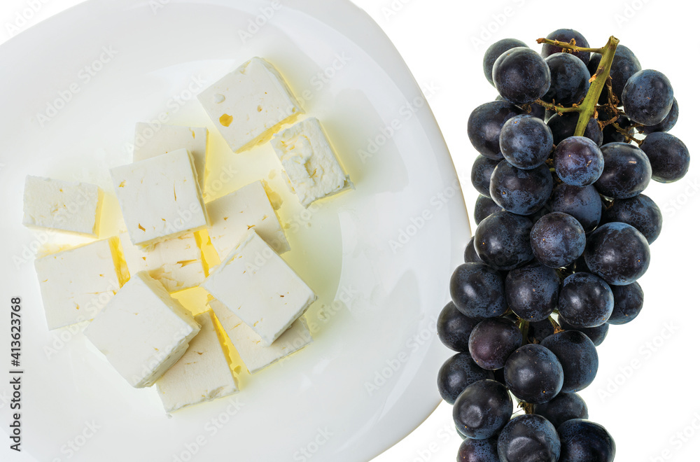 Close up view of black grape and brined white Feta cheese on white background. Healthy eating concept.