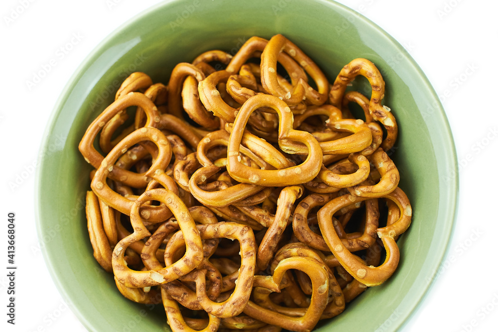 Yellow heart-shaped crackers in the plate isolated on white background.