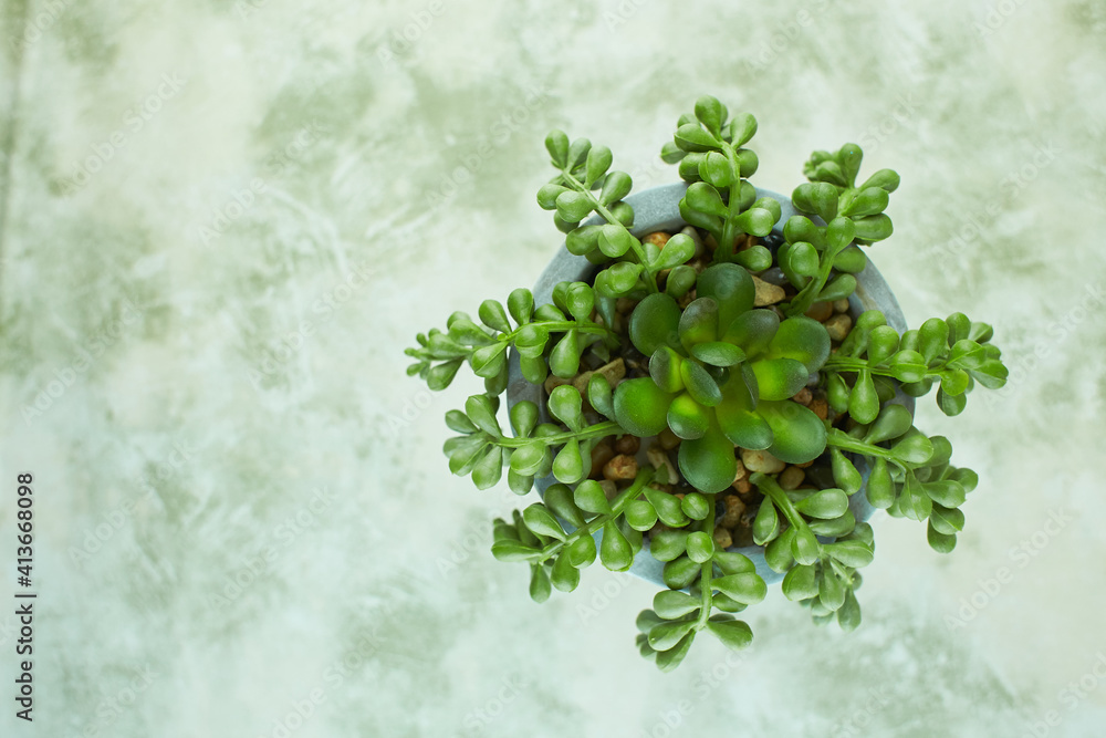 Succulent plant in pot on green grunge cement texture background. Style interior decoration.