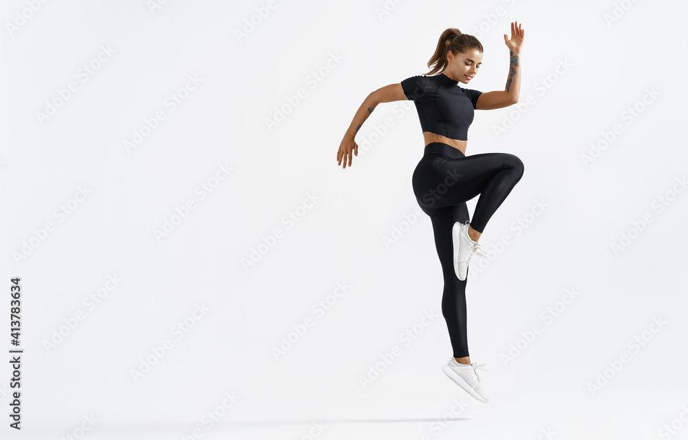 Fit woman exercising indoors. Healthy young female athlete doing fitness workout. Sportswoman in sport clothing jumping on white background, training muscles before running