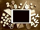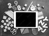 Tablet with blank screen lies on school supplies. Black board on background. Concept for online study for elementary school children, distance learning, back to school. Copy space. Top view. Mock up.