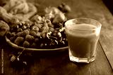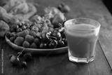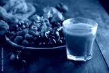 Fresh organic summer berries mix in round wooden tray with glass of juice on dark wooden table background. Raspberries, strawberries, blueberries, blackberries and cherries.