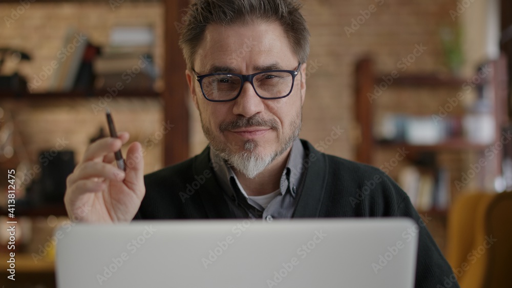Happy older man working online with laptop computer at home sitting at desk. Home office, browsing internet, study room. Portrait of mature age, middle age, mid adult man in 50s.