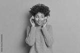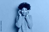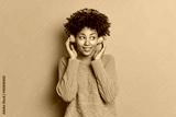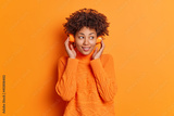 Thoughtful pretty millennial female with Afro hair listens music concentrated aside wears wireless headphones on ears dressed in long sleeved casual sweater isolated over orange studio background