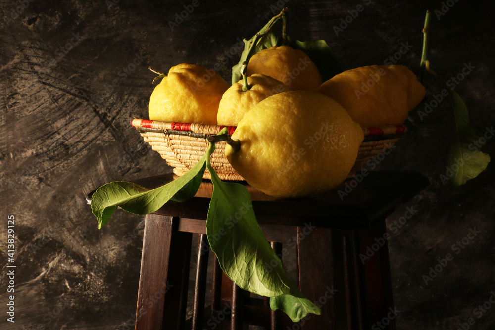 Composizione di limoni; natura morta su fondo scuro