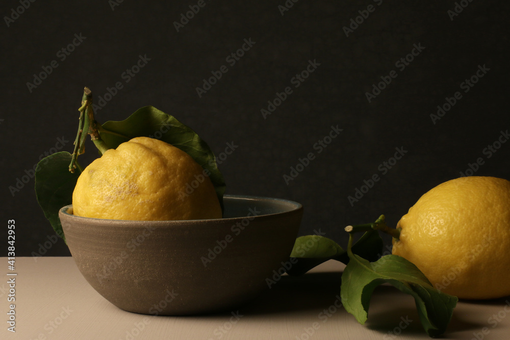 Limoni. Natura morta con ciotola su fondo grigio, come fosse un dipinto