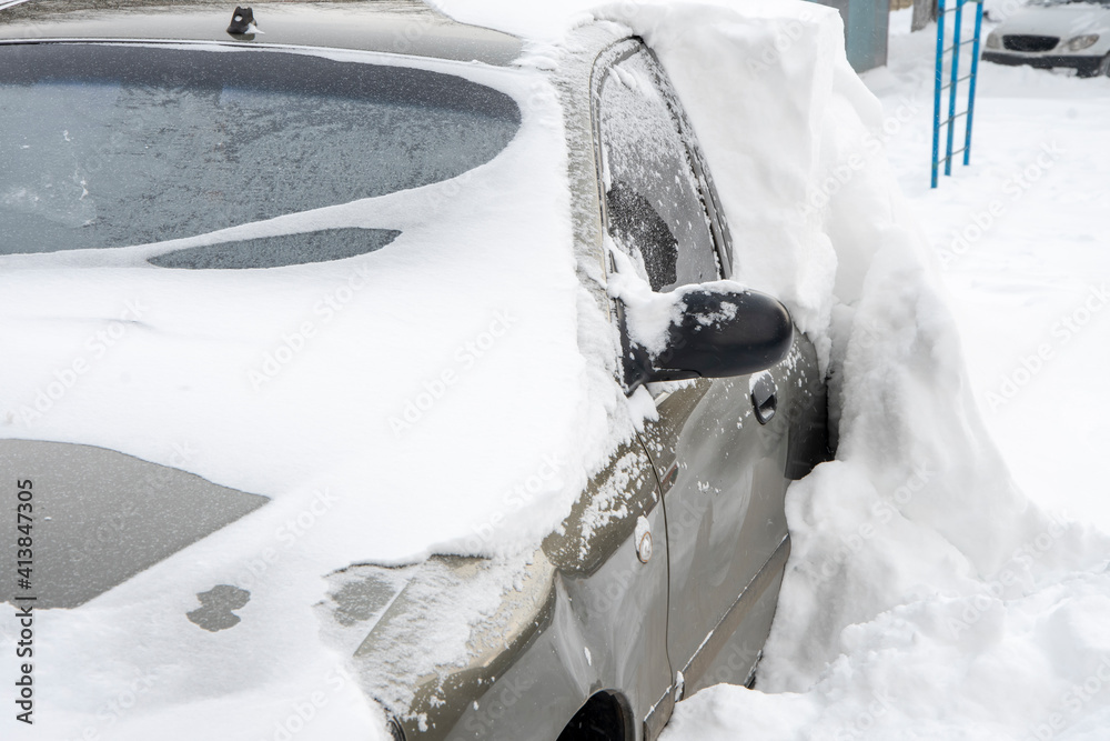 Parked cars, covered in snow, stand along the road. Snowfall in the city, falling snowflakes. Concept: traffic collapse, increased precipitation and snow levels, snowstorms and snow drifts.