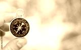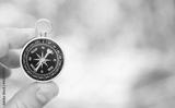Old classic navigation compass in hand on natural background as symbol of tourism with compass, travel with compass and outdoor activities with compass