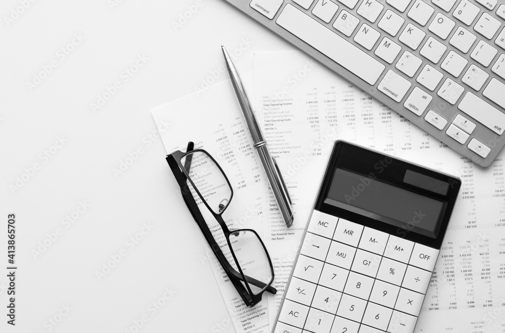 Calculator on financial statement and balance sheeet on desk of auditor. Concept of accounting and audit business.