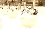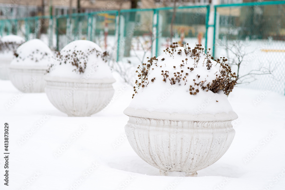 Flower vases covered with snow outside. Big flower pot covered in fresh snow in winter park