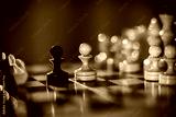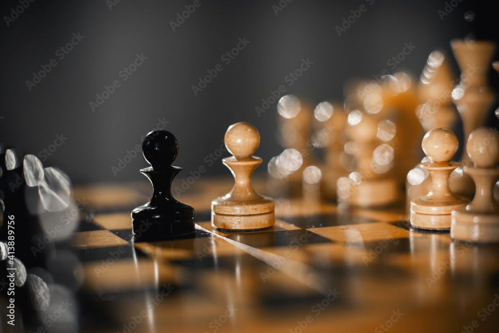 Two pawns - black and white. Wooden chess pieces on the chessboard.