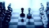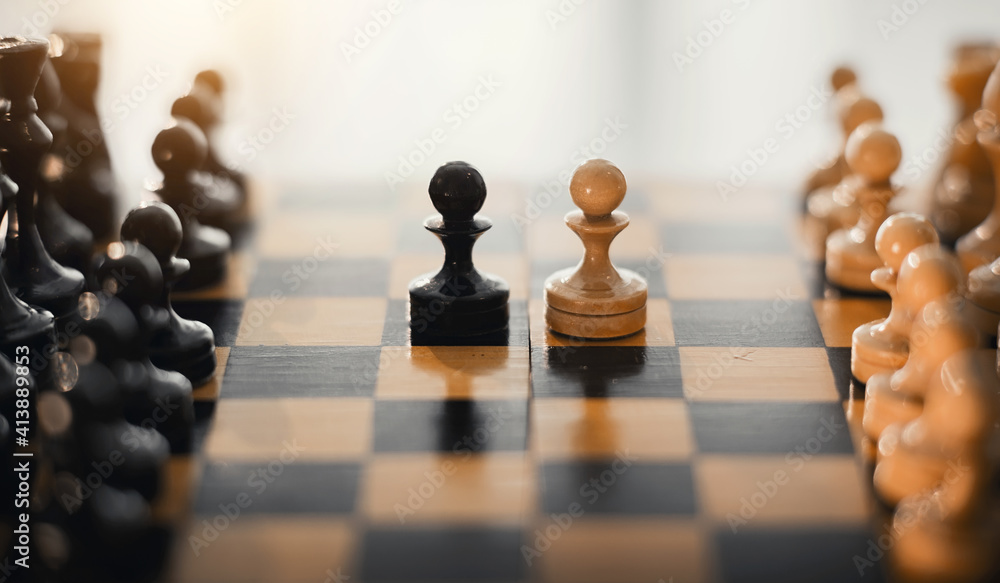 Two pawns - black and white. Wooden chess pieces on the chessboard.