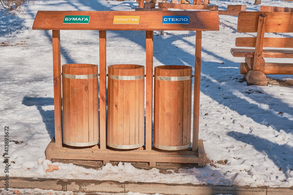 Wooden stylized garbage bins for sorting waste in a city park in Kislovodsk, Russia.