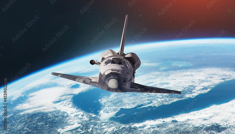 Spaceship in space near Earth planet. View from outer space. Clouds and oceans. Continents on surface. Elements of this image furnished by NASA