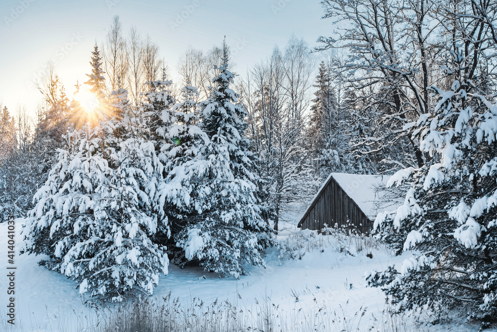 Winter scene, into the woods full of snow during cold winter, with a wooden cabin in distance.