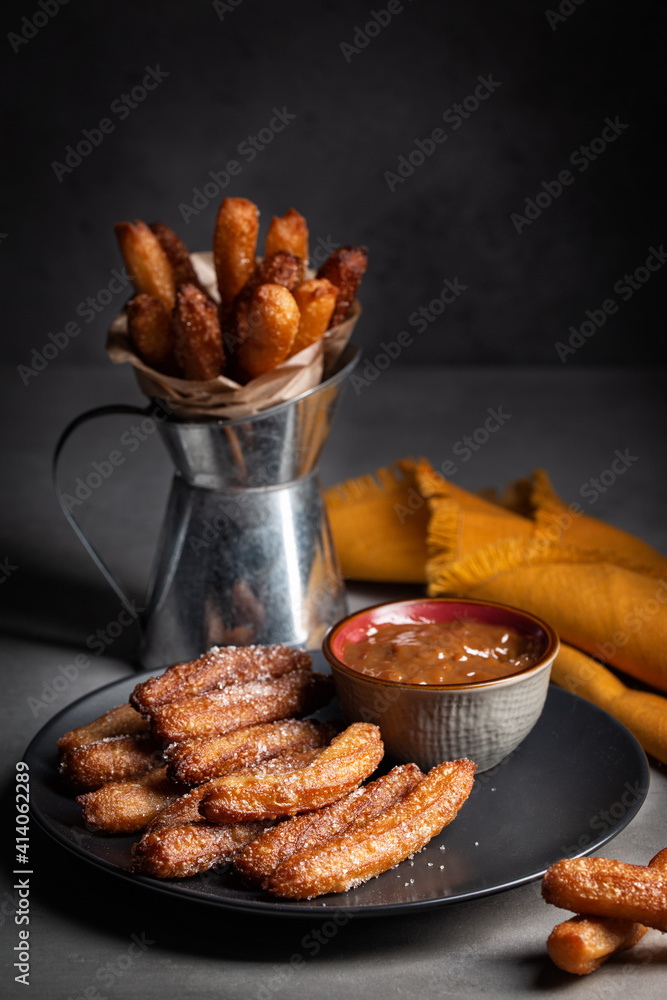 A plate with churros - fried dough, with dulce de leche, slowly heating sweetened condensed milk. Dark background, vertical image.