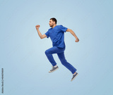 healthcare, profession and medicine concept - doctor or male nurse in uniform jumping in air over blue background