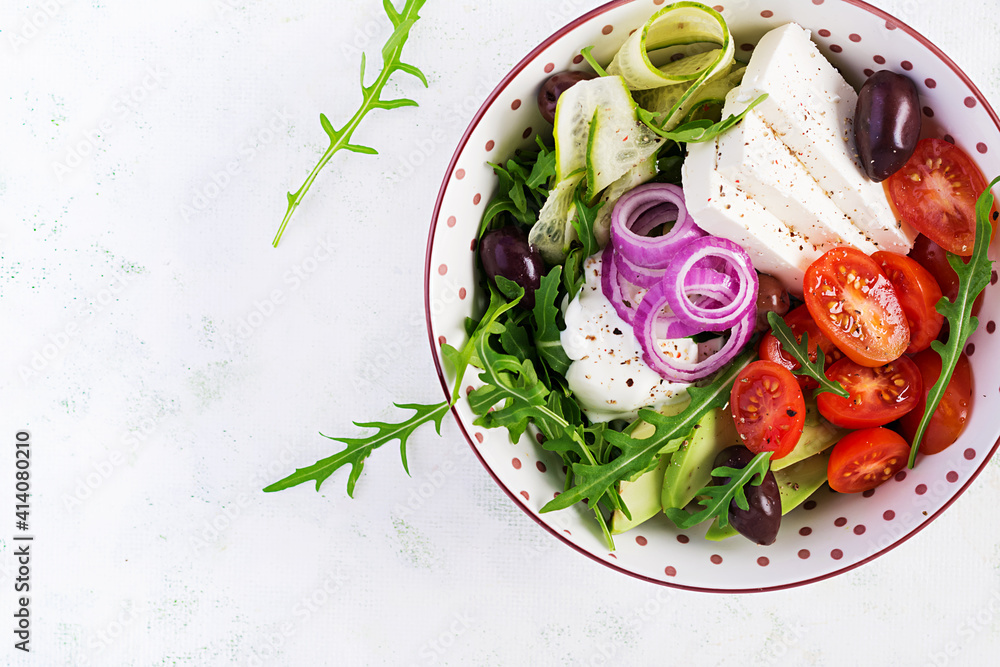 Healthy Greek salad of fresh cucumber, tomato, avocado, arugula, red onion, feta cheese and olives. Healthy food, vegetarian dieting. Top view, overhead, above
