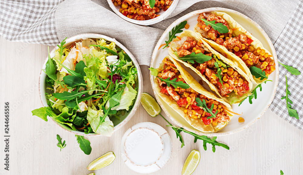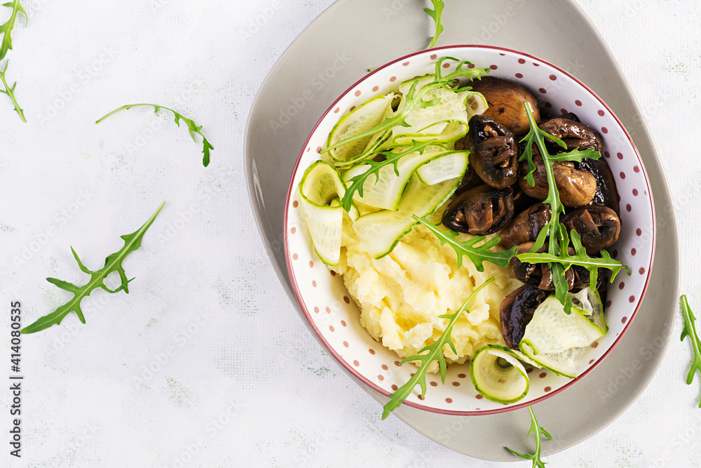 Healthy vegan lunch with mashed potatoes and roasted mushrooms with fresh cucumber. Vegan, vegetarian meal. Top view, flat lay, above