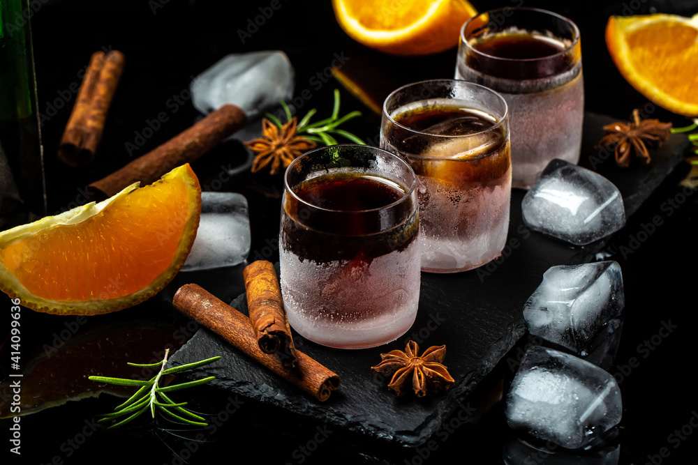 frozen herb liqueur in small glass. Shot glass of herb liqueur with cinnamon and oranges on a dark background