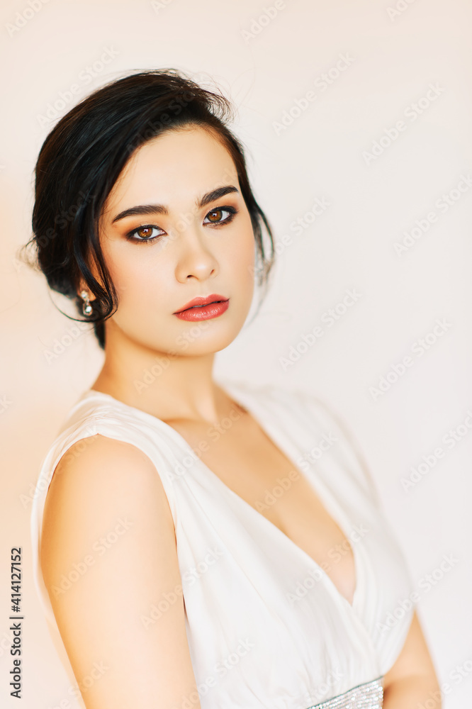 Fashion portrait of elegant young woman with tender makeup and romantic hairstyle, wearing white dress
